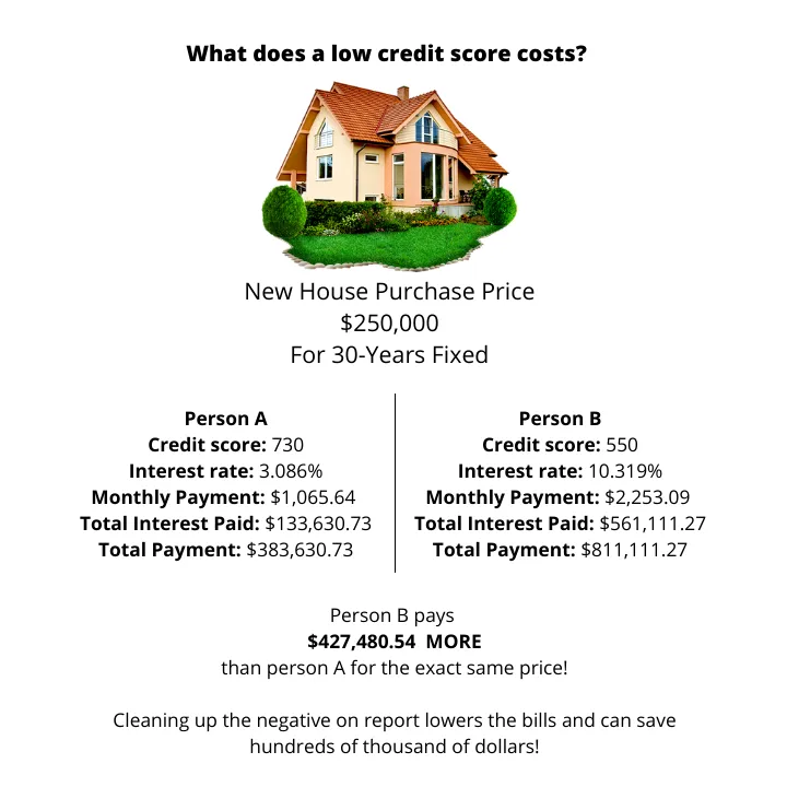 Here is a quick example of how financing a new house at $250,000 for 30 years fixed would cost you with a 730 Credit Score Vs a 550 Credit Score.